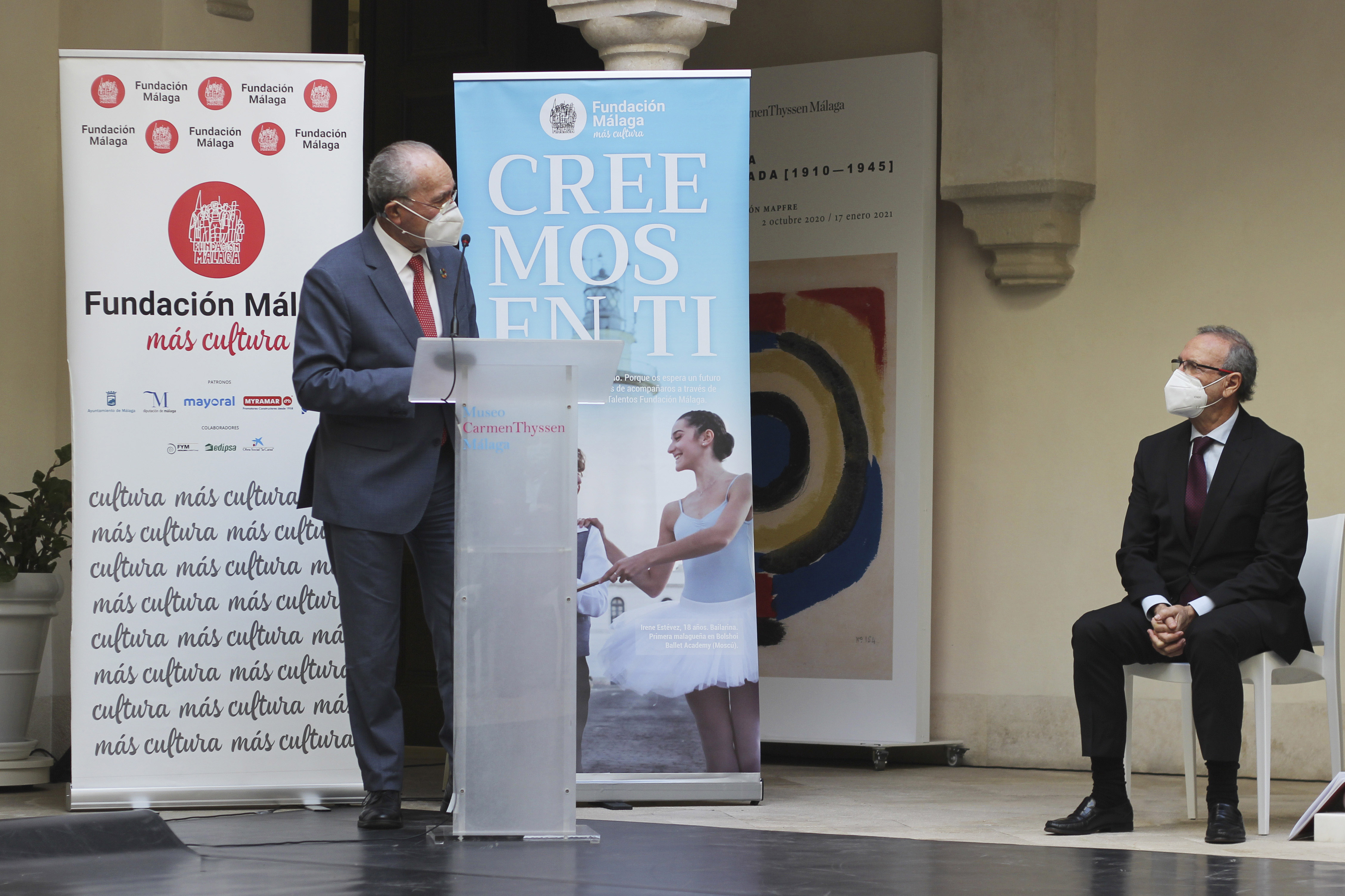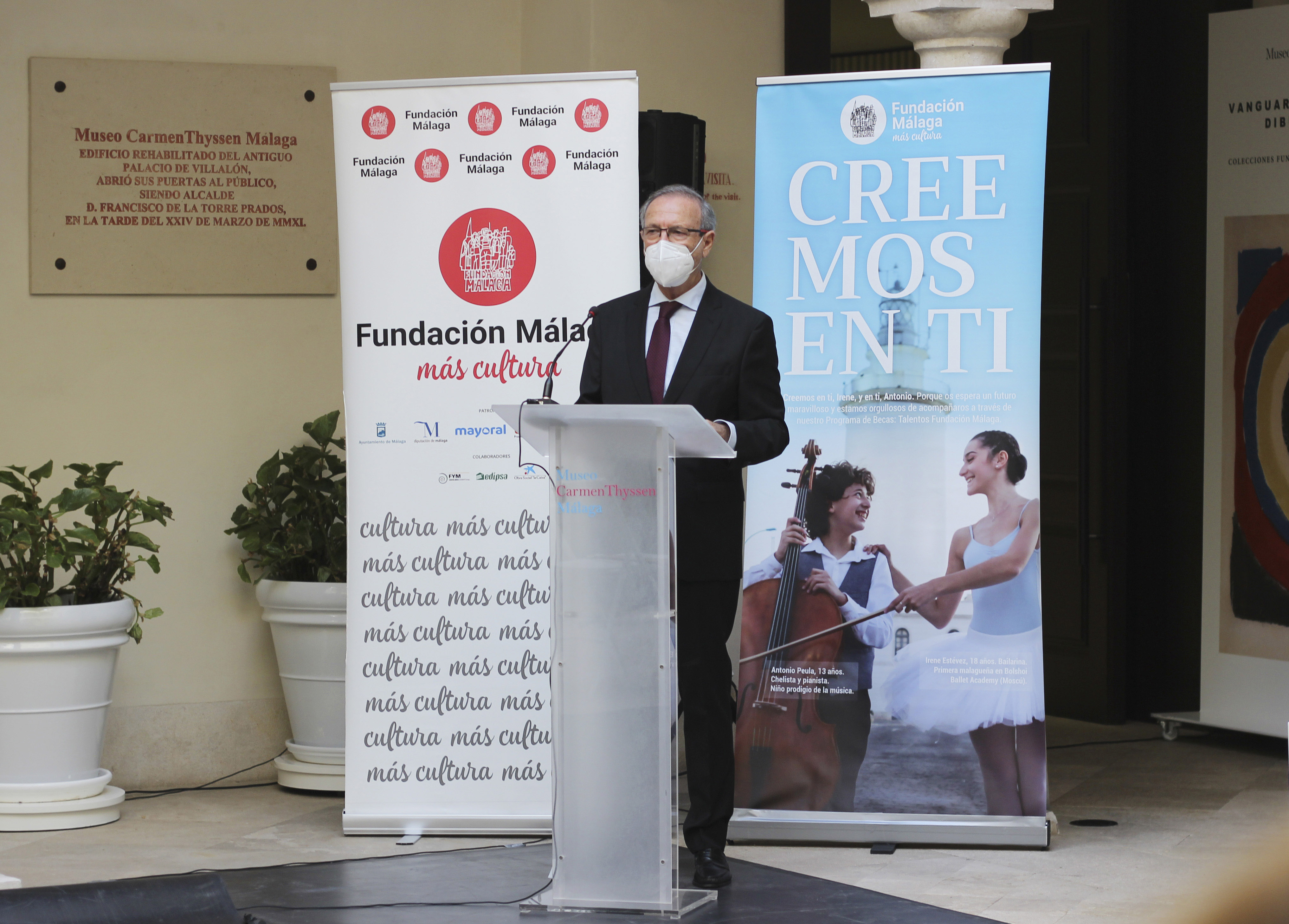 En el acto, que ha tenido lugar en el patio del Museo Carmen Thyssen cumpliendo la normativa sanitaria vigente para actos culturales, han intervenido el presidente de Fundación Málaga, Juan Cobalea; el alcalde de Málaga, Francisco de la Torre; y el barítono Carlos Álvarez, invitado de honor. Asimismo, ha contado con las actuaciones de Irene Estévez, bailarina en The Bolshoi Ballet Academy de Moscú, y Antonio Peula, prodigio del chelo y el piano, becados por Fundación Málaga y que, por primera vez, han actuado juntos ante el público. El evento ha sido retransmitido en streaming a través de las redes sociales (Facebook e Instagram) de Fundación Málaga y estará disponible en el canal de YouTube.