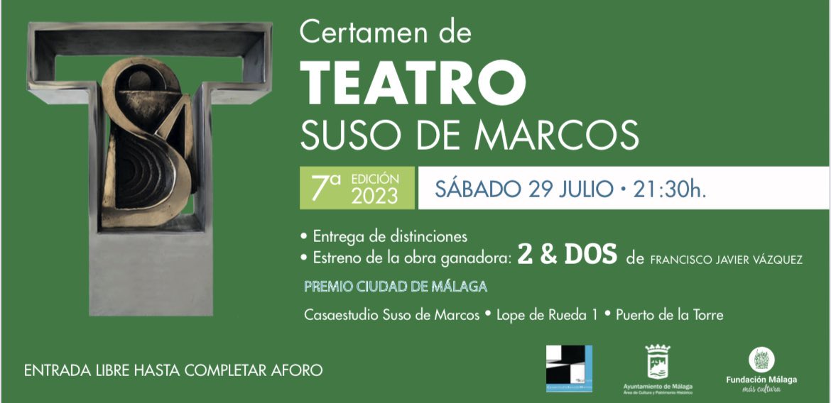 Esta noche se ha celebrado la séptima edición del Certamen de Teatro Suso de Marcos que se celebra en la Casa Museo del escultor afincado en Málaga. El encuentro teatral es la cita en la que se entrega el Premio Ciudad de Málaga de Teatro que co patrocinan el Ayuntamiento de Málaga y la Fundación Málaga.