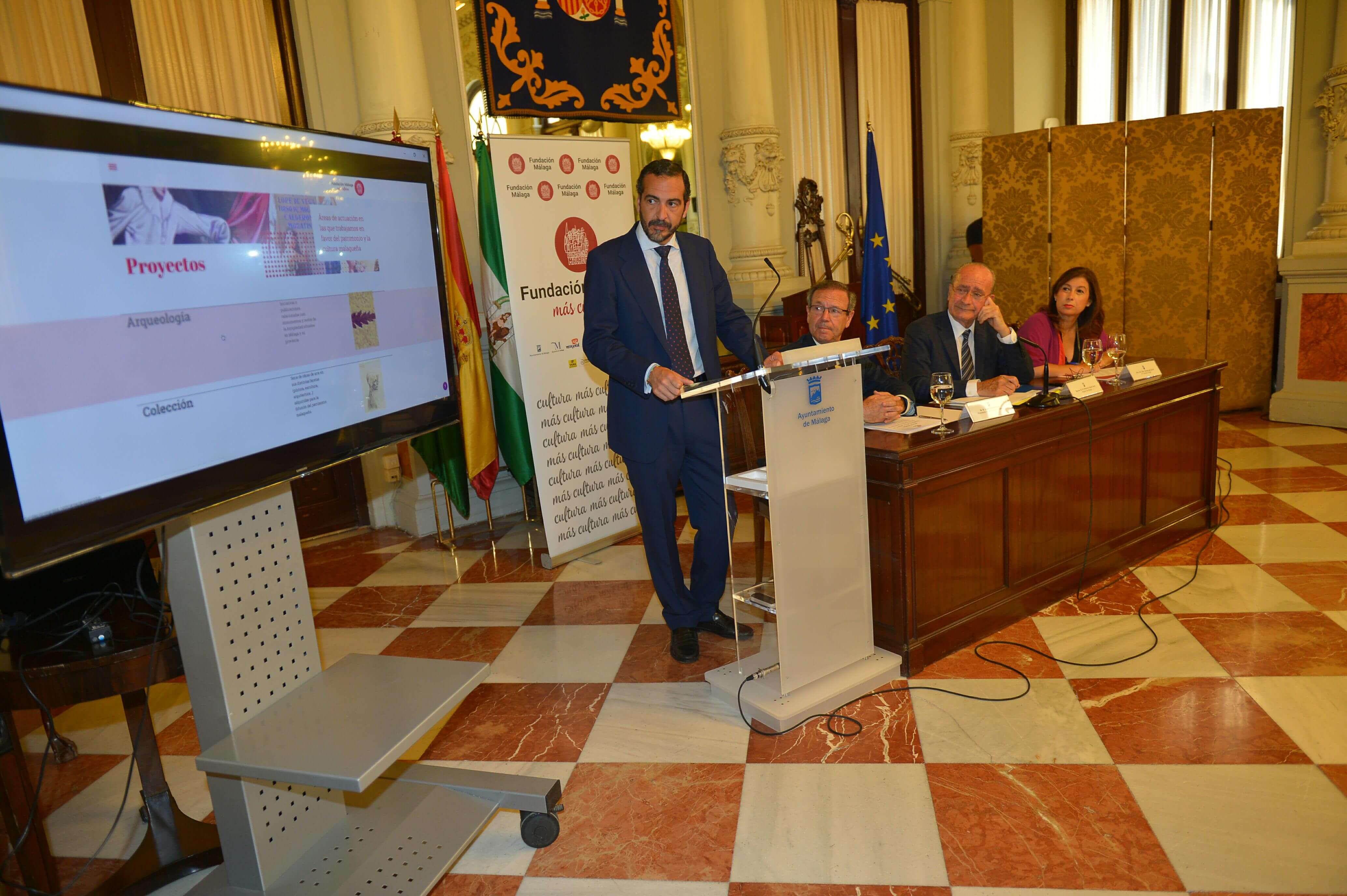 Los nuevos proyectos culturales de la Fundación Málaga han sido presentados en el Salón de los Espejos por el alcalde, Francisco de la Torre; el presidente de la Fundación Málaga, Juan Cobalea; y el director general de Coonic -empresa que ha desarrollado el proyecto web- Ignacio Luque.