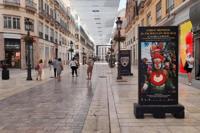 Exposición en calle Larios de imágenes relacionadas con la exposición ‘Otros mundos, el Pacífico en Málaga’