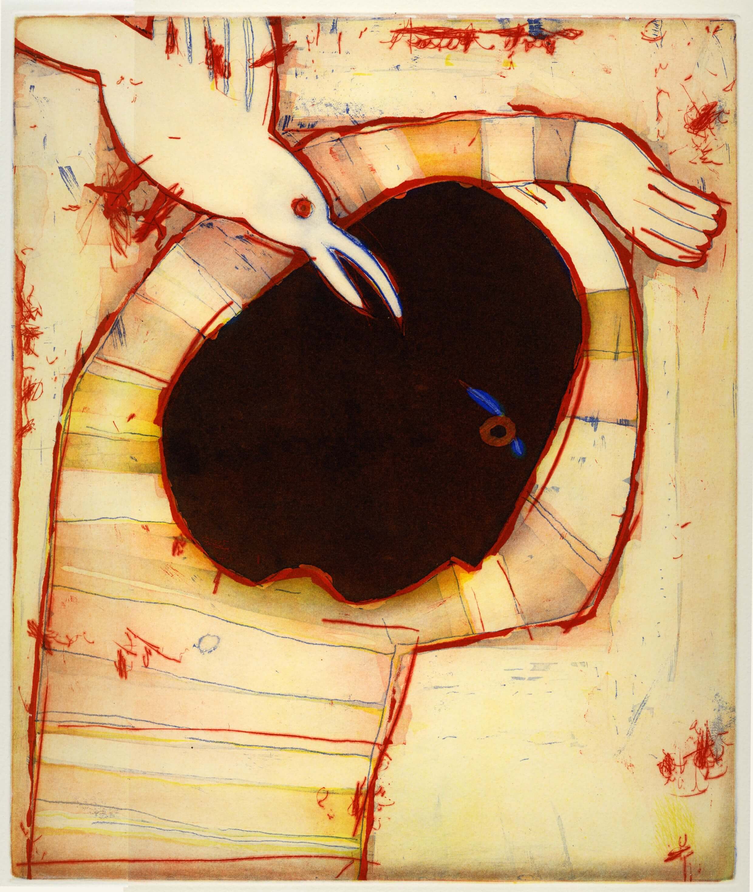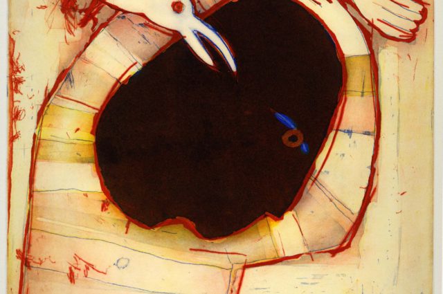 The work is entitled “Blues” (76 x 56 cm) and has been elaborated using three plates: one copper and two zinc, with etching and dry point techniques. As Diazdel says: «The original idea, the beginning, was to work on a big black spot in the centre of the plate and leave the rest almost white; it would be a character (the black spot) played by the blues (the bird) and whose result was like a song by Rainer, but then there were more lines, more spots and more colour… and the final result I think is closer to a Corey Harris blues than to Rainer… but I like it». The work is part of Diazdel’s artistic line, characterized by a direct, simple language, a daring play of colours, as well as a tension between the figure and the stage that is always resolved in a fortunate way.